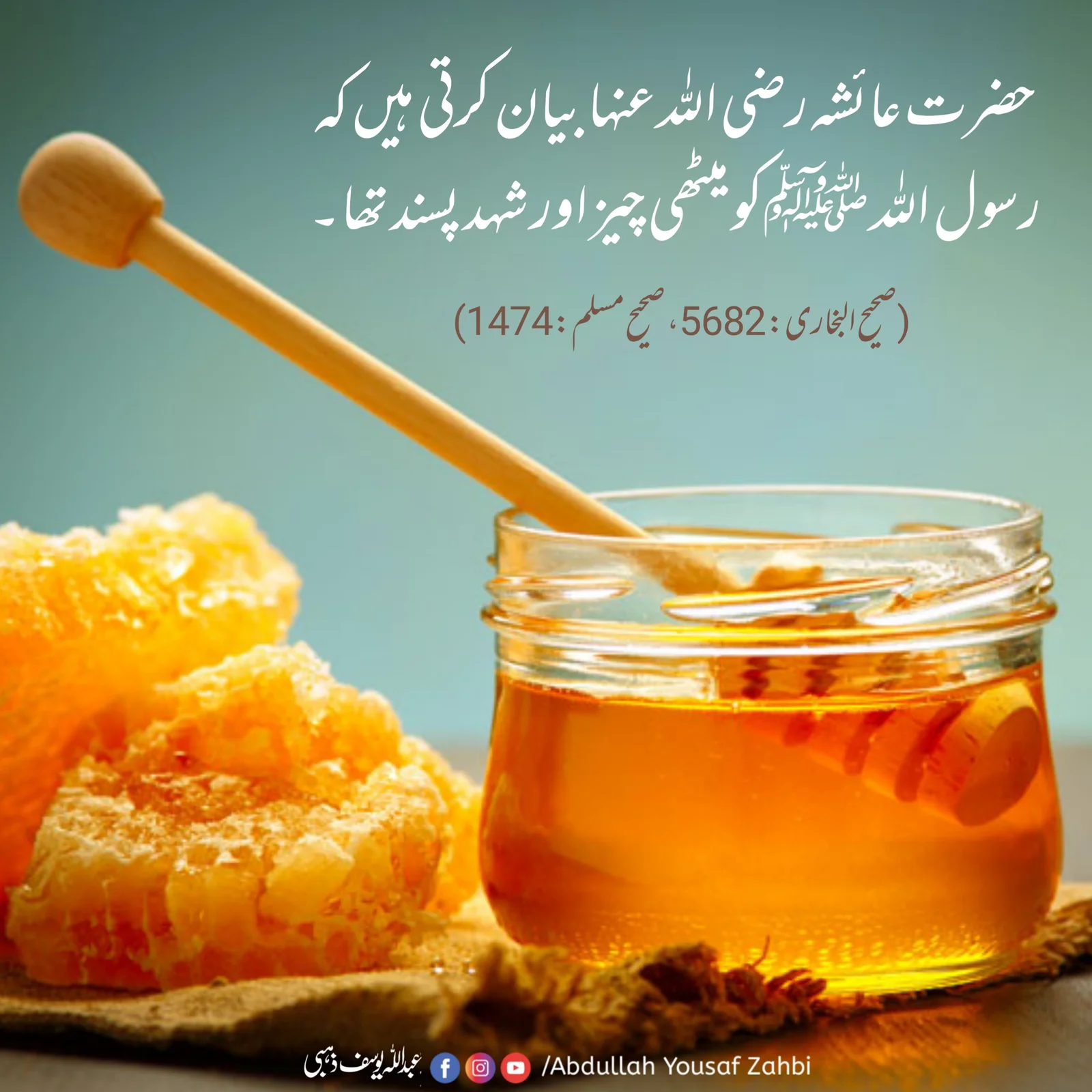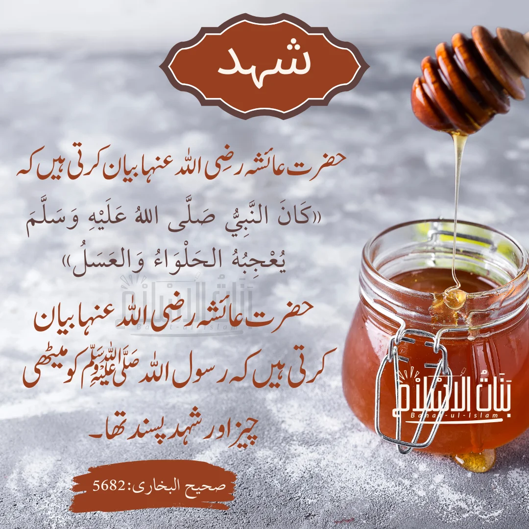 حضرت عائشہ صدِّیقہ رضی اللہُ عنہا فرماتی ہیں:نبیِّ کریم صلَّی اللہ علیہ واٰلہٖ وسلَّم میٹھی چیز اور شہد پسند فرماتے تھے۔