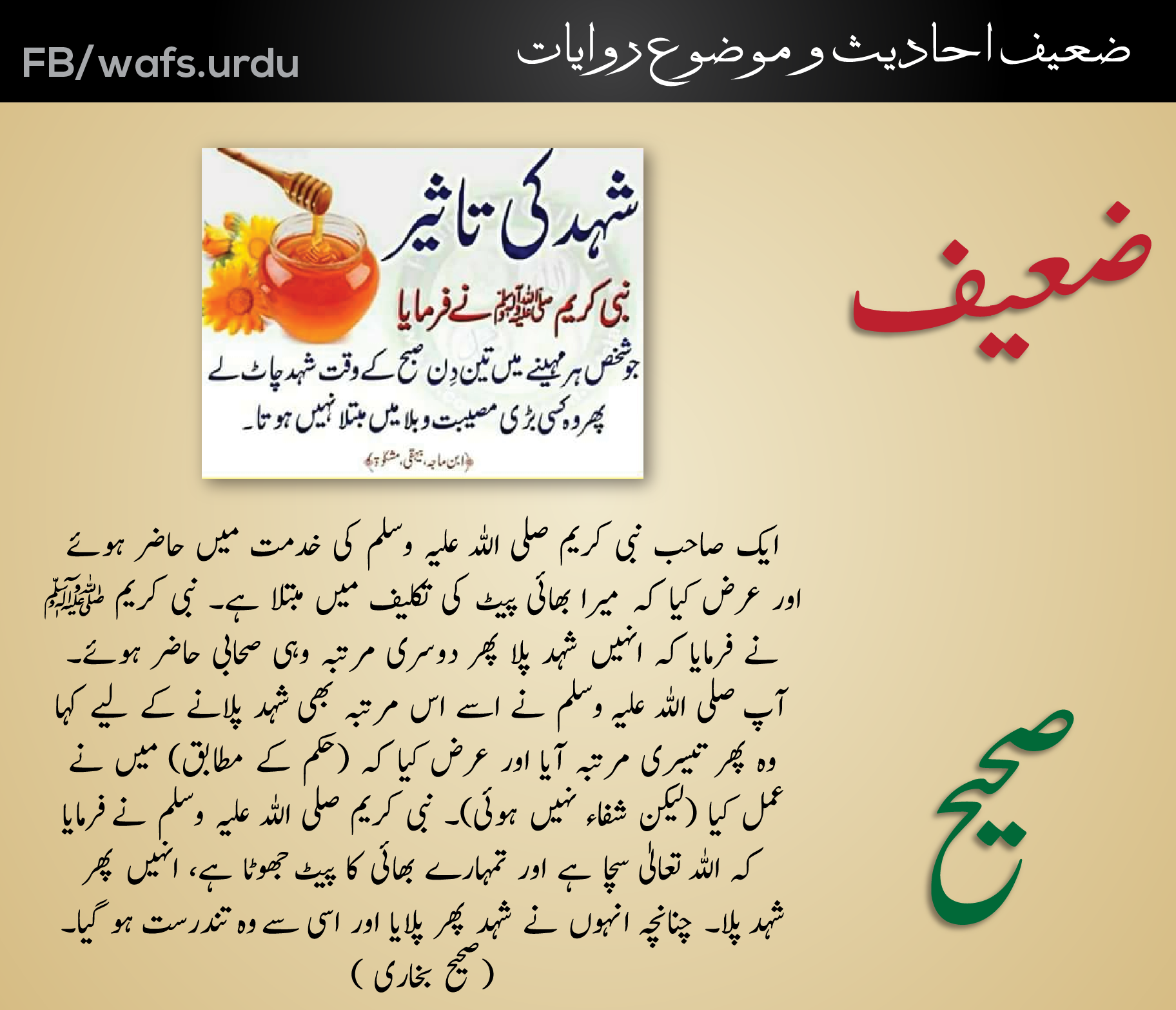 حضرت ابو سعید خُدری رضی اللہُ عنہ سے روایت ہے کہ ایک شخص نبیِّ کریم صلَّی اللہ علیہ واٰلہٖ وسلَّم کی خدمتِ اقدس میں حاضر ہوا اور عرض کی کہ میرے بھائی کو پیٹ کی بیماری ہے، آپ نے فرمایا: اس کو شہد پلاؤ، پھر دوسری بار آیا تو آپ نے فرمایا: اس کو شہد پلاؤ، پھر (تیسری بار) آیا اور عرض کیا کہ میں نے پلایا (لیکن فائدہ نہیں ہوا) آپ نے فرمایا: اللہ سچا ہے اور تیرے بھائی کا پیٹ جھوٹا ہے، اس کو شہد پلاؤ، چنانچہ اس نے پھر شہد پلایا تو وہ تندرست ہوگیا۔