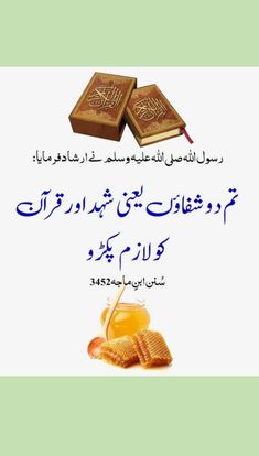 نبیِّ کریم صلَّی اللہ علیہ واٰلہٖ وسلَّم نے ارشاد فرمایا: دو شفاؤں کو لازم پکڑو، ایک شہد، دوسری قراٰن شریف۔